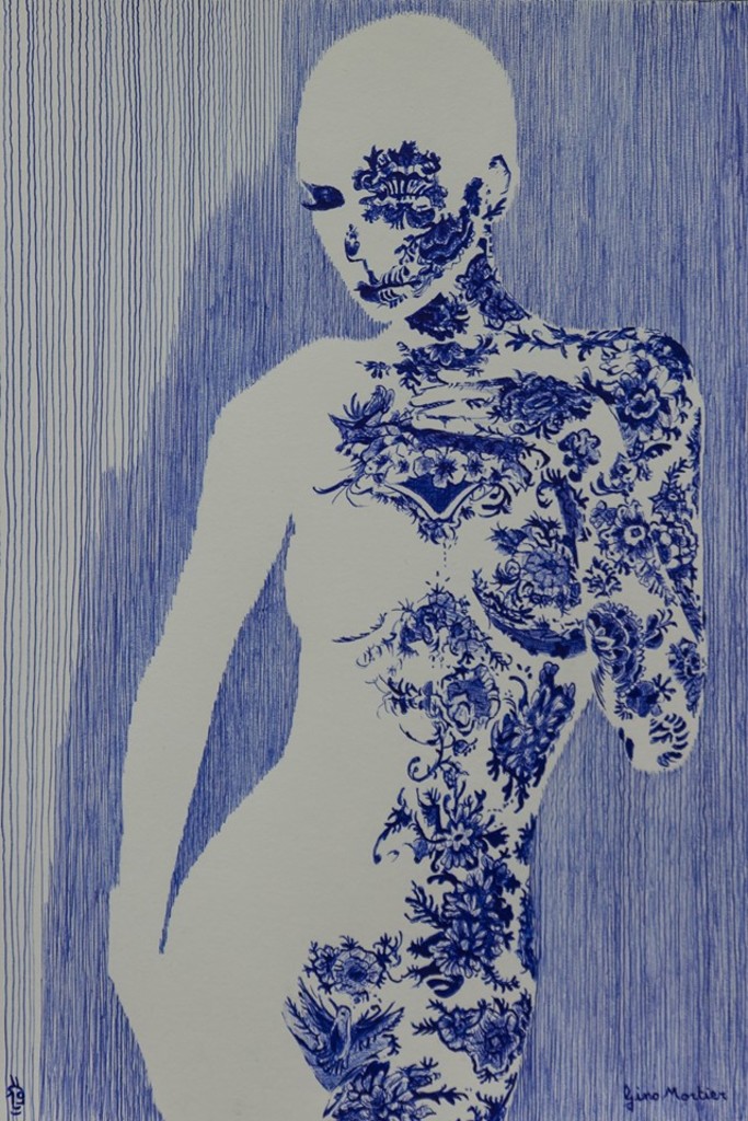 naakt met blauwe delftse bloemen.