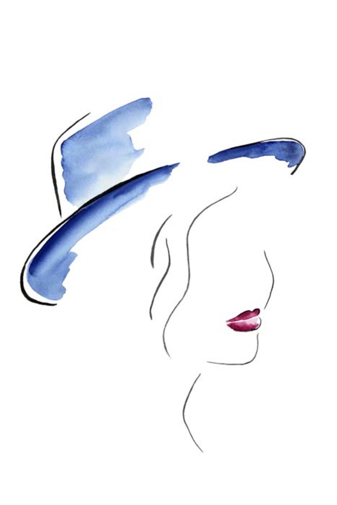 Schilderij Wit Meisje Rood Zwart Romantiek Vrouw Art Gezicht Aquarel Kunst Schilderkunst Roze Lichtblauw Hoed Romantisch Haar Erotiek Minimalisme Dame Lippen Donkerblauw Kunstwerk Lippenstift Lijntekening