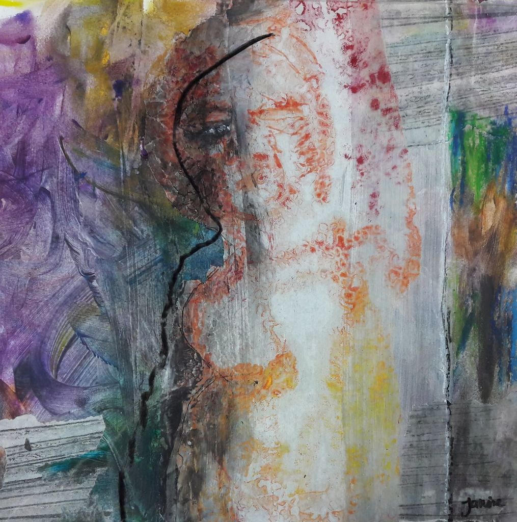 Samengaan van geschillende technieken zoals monotype, was en schilderen op plexiglas. In een 3D lijst ingelijst zodat reliëf en schaduwval een belangrijk onderdeel is van het werk.