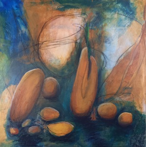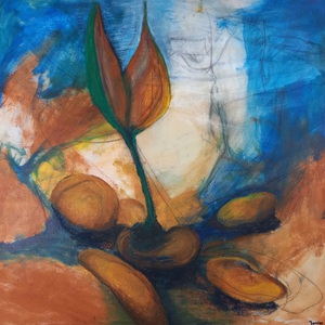 Samengaan van geschillende technieken zoals monotype, was en schilderen op plexiglas. In een 3D lijst ingelijst met suggestie van een ruimte, zodat reliëf en schaduwval een belangrijk onderdeel is van het werk.