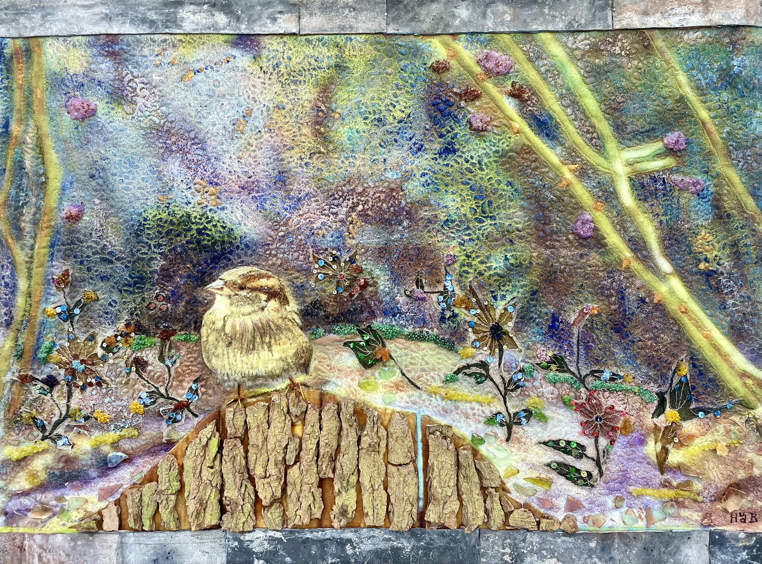 Ik ben een materialen mens, en maak samenvoegingen van verschillende materialen; foto’s, stoffen en borduursels, soms ook gecombineerd met hout, lood en steen, op wisselende formaten