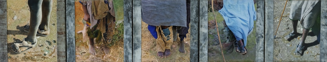 Serie van voeten uit Ethiopie. Fotografie, stikwerk, diverse materialen, acrylverf op linnen doek