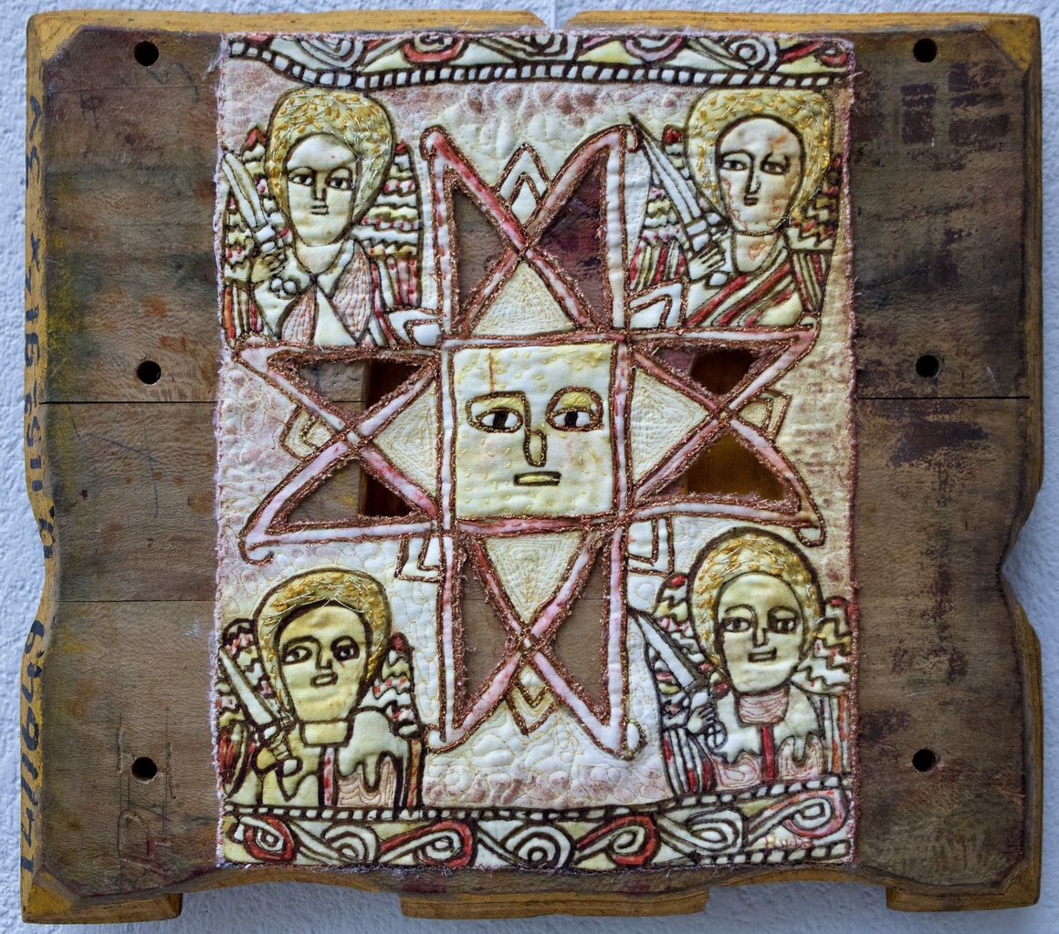 EThiopisch kruis met engelen, textiel, geborduurd. Op houten mal