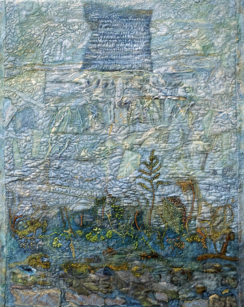 Johannes 1: ‘Het Woord was bij God en het Woord was God Door het Woord is alles ontstaan.’ Bovenin zweeft het ‘Woord’, de blauwdruk voor de wereld,Gegeven door de Schepper,.van licht en water,..boven en beneden ..de zee en het droge ..de vissen en de vogels, de al Ene, de Bron, de Eeuwige. Hij die zegt:..heb je mij lief? ..vier het leven ..ik zal je zegenen. Textiel, stikwerk, handborduren, wol, acrylverf