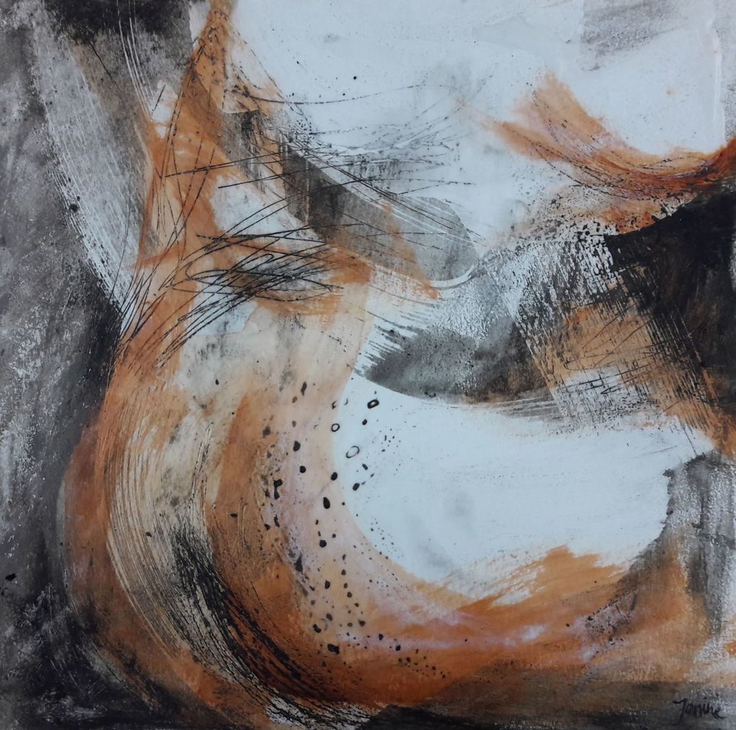 Een abstracte onderschildering met acrylverf. Hierop gewerkt met was. Op de afbeelding vrouwelijke vormen. Door te krassen in de was en geheel in te wassen met assen ontstaat er een lijnenspel in het werk.