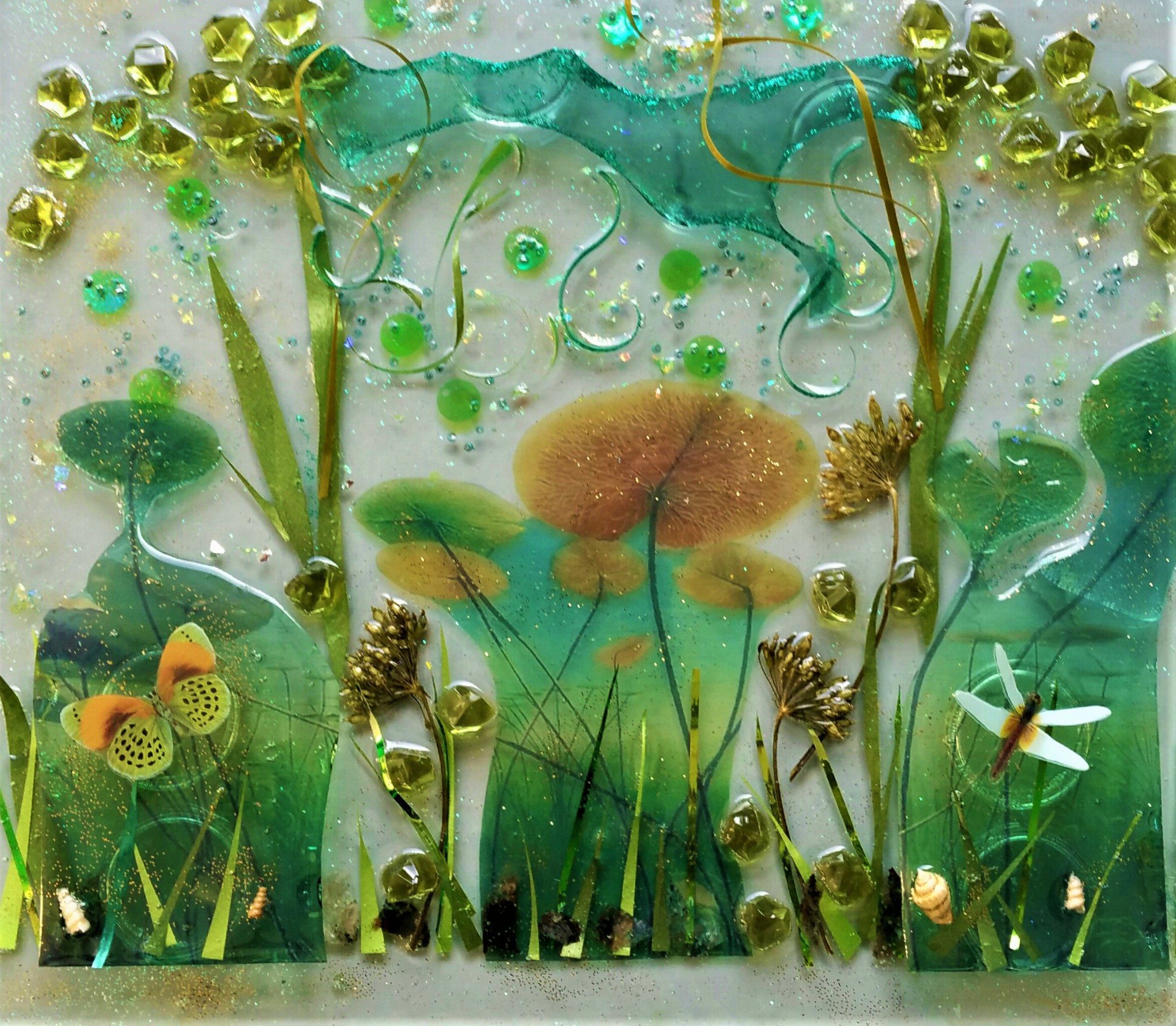 Waterplanten, gemengde techniek, kunsthars op glas. staat in een standaard