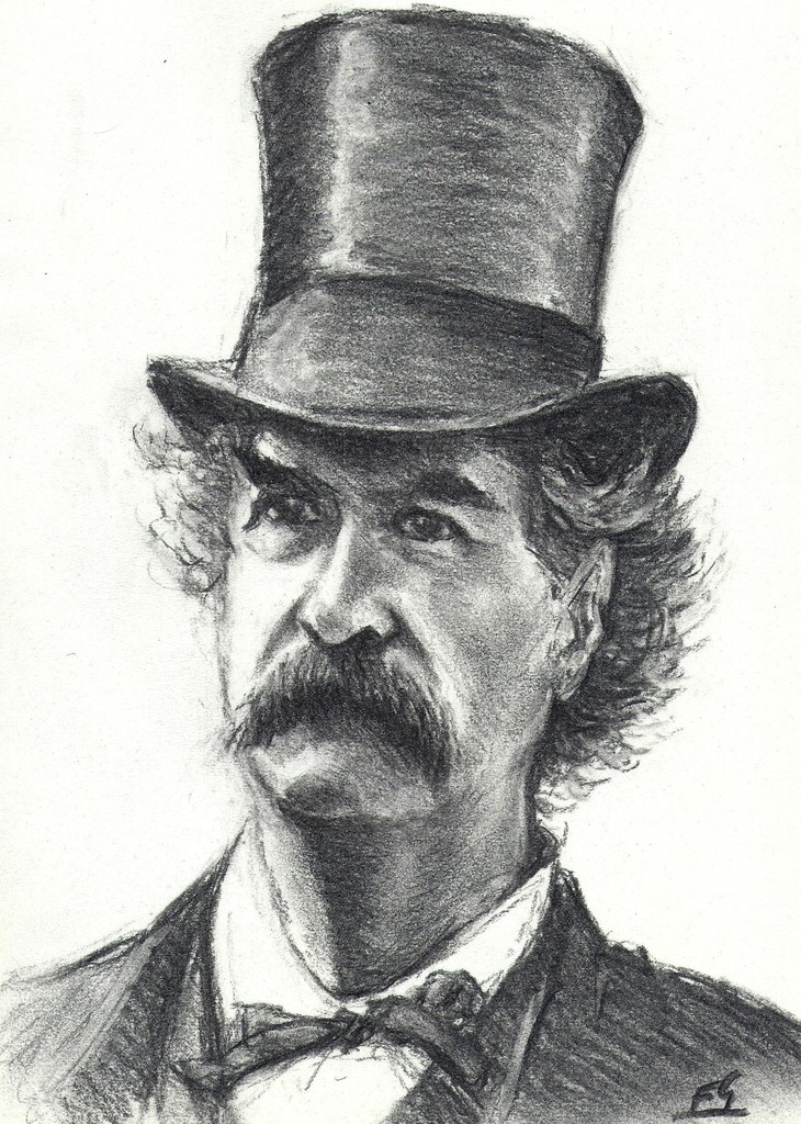 Houtskool portret tekening van een oude heer met een hoge hoed.