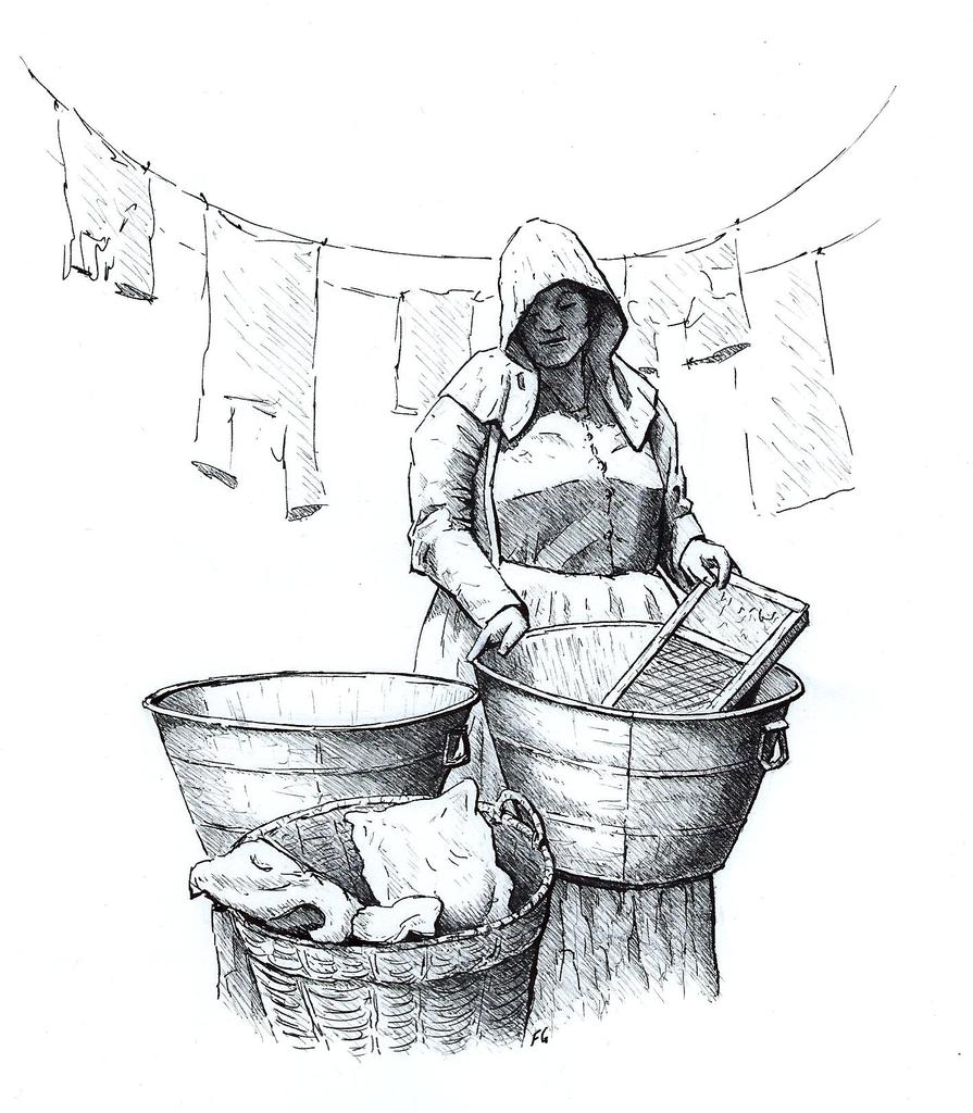 Pen en inkt illustratie van een vrouw in traditionele kleren van vroeger die op de ouderwetse manier de was doet.