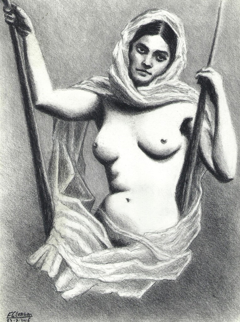 Klassikaal naakt van een jonge vrouw speels met een licht gewaad in houtskool potlood naar oude foto referentie.