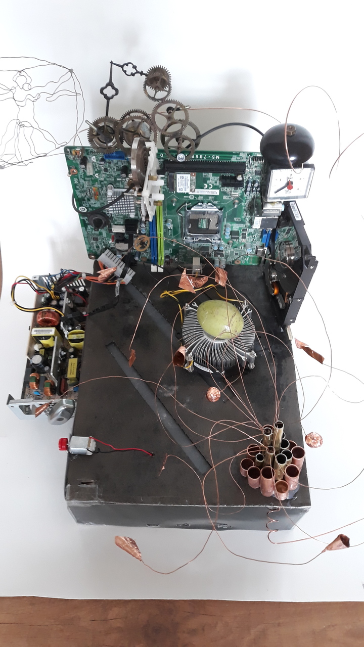 Interpretatie 1 Het is een universele broedmachine gemaakt door Da Vinci en bedoeld voor het uitbroeden/laten ontkiemen van eieren, zaden en mensen. Eigenlijk een broedmachine voor alle levende entiteiten. De ziel, het karakter en andere eigenschappen worden ingeblazen/ingebracht door de koperen communicator. Alle processen worden beheerd en gecontroleerd door de klok en pc-elementen Interpretatie 2 Deze assemblage van elementen is een weergave van een andere dimensie van deze wereld. Een dimensie waar tijd niet bestaat (de tandwielen van de klok zijn geblokkeerd). In deze dimensie van onze wereld waar geen volgtijdelijkheid bestaat, bestaat dus alles tegelijk, of er bestaat niets. In dit werk bestaat alles tegelijk, de werken van Da Vinci, Brancusi, Horn, Intel en al het andere. Interpretatie 3 Het is een opdracht vanuit de Academie Arendonk om een assemblage te maken. Deze assemblage is een hommage aan Leonardo da Vinci, de uitvinding van het (tand)wiel, uitvinders van de klok, de beeldende kunstenaars Constantin Brancusi en Rebecca Horn en de IT-technology bedrijven Intel en Microsoft.