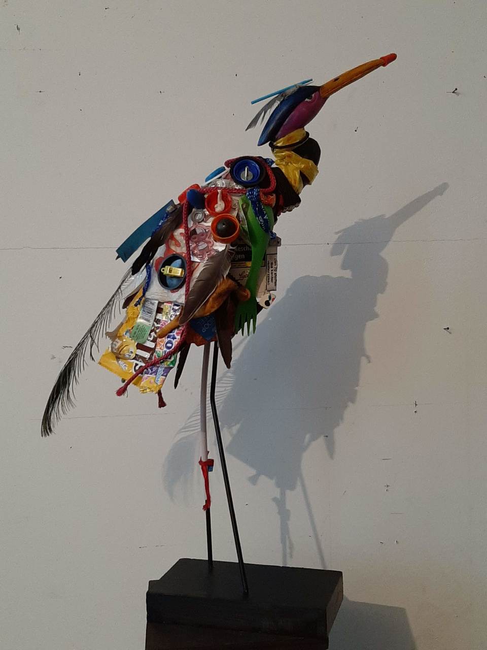 The fittest bird Please recycle. Statue made with small waste that I found while walking with my dog in our green environment. Can birds still survive if even green neighborhoods are so polluted?