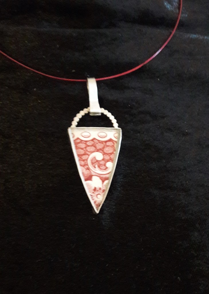 Zilveren hanger, met scherf van 'Delfts Rood'. Aan rode spang.