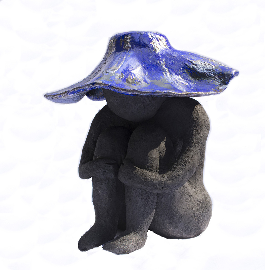 Zittend meisje met blauwe hoed Keramiek Raku gestookt