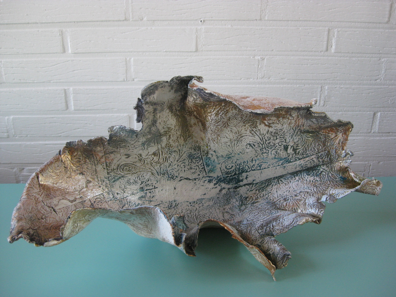 Organische sculpturen die voortkomen uit de zoektocht, de verwondering voor natuurelementen als fossielen, zeewieren,koralen, de schoonheid van hun afdrukken, de kleur van parelmoer.