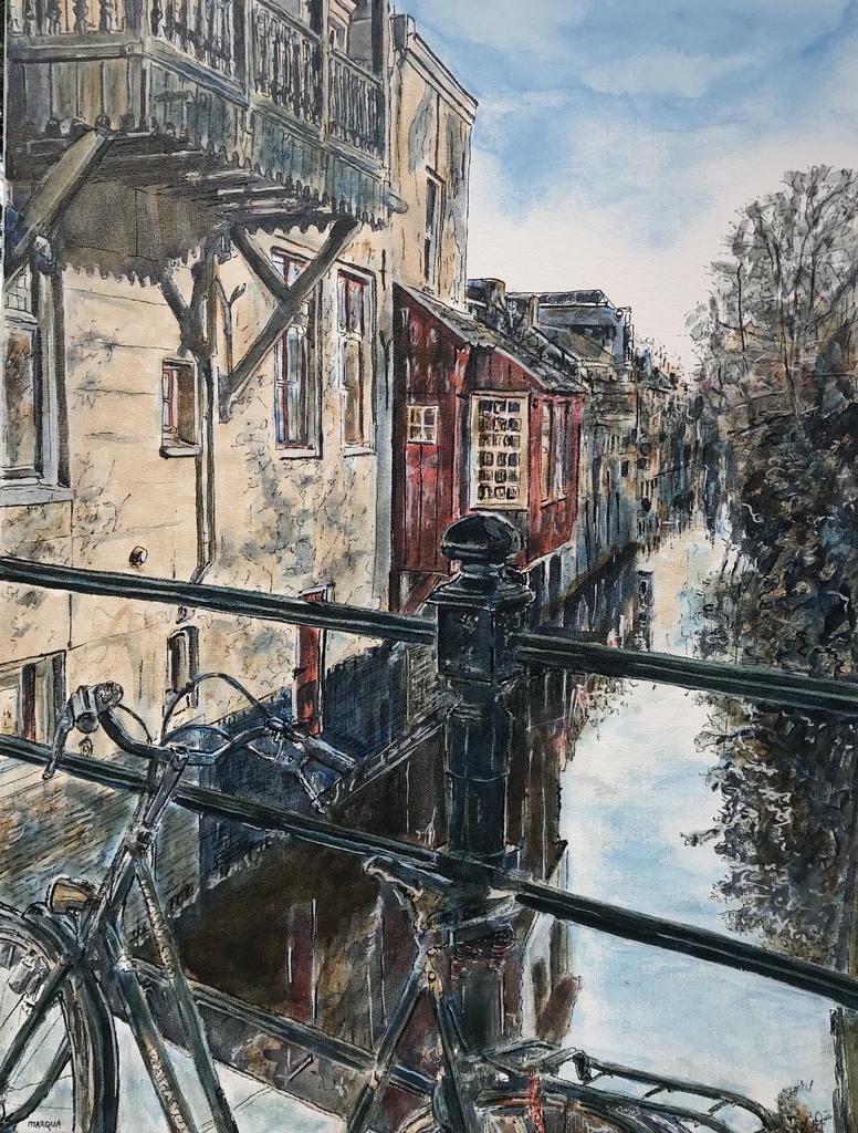Inktschilderij, de Geerlingse Brug met mijn oude fiets op linnen doek 60x80 cm. Oost-Indische en diverse kleuren inkt met rietpen en penseel.