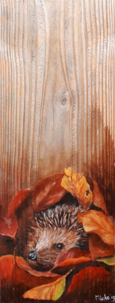 Egel tussen de herfstbladeren, geschilderd op een houten plank