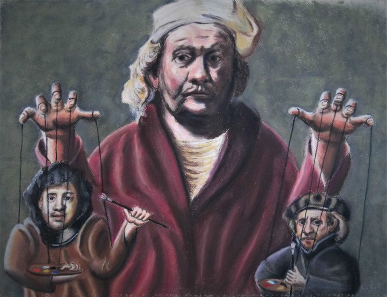 Rembrandts leven als kunstenaar. Zijn handen zijn verbonden met de marionetten als de jonge Rembrandt en Rembrandt van middelbare leeftijd. Rembrandt is hier zowel kunstenaar als de poppenspeler van zijn leven.