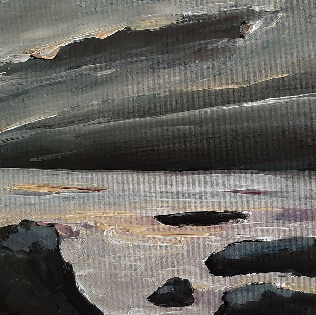 Het plan om een aantal kleine (25x25) 'seascapes' te schilderen in een wat losse stijl, en met een beperkt aantal kleuren, probeer ik nog even door te zetten. Dit schilderijtje (in acryl) is de 1e van de tweede reeks van drie. Bij het schilderen van deze klein-formaat seascapes heb ik me laten inspireren door de ruige Normandische kusten, een gebied waar ik elk jaar, verdeeld over de verschillende seizoenen, wel een keer te vinden zijn. Het zijn intieme, naar abstract neigende mini zeelandschapen, waar de kust, het strand en de zee, en de lucht een soort drieëenheid vormen.
