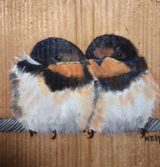 Twee nestvlieders houden elkaar warm. Olieverf op hout