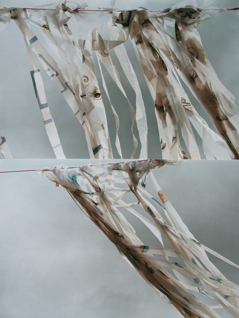 tweeluik van foto's van plastic stroken aan prikkeldraad