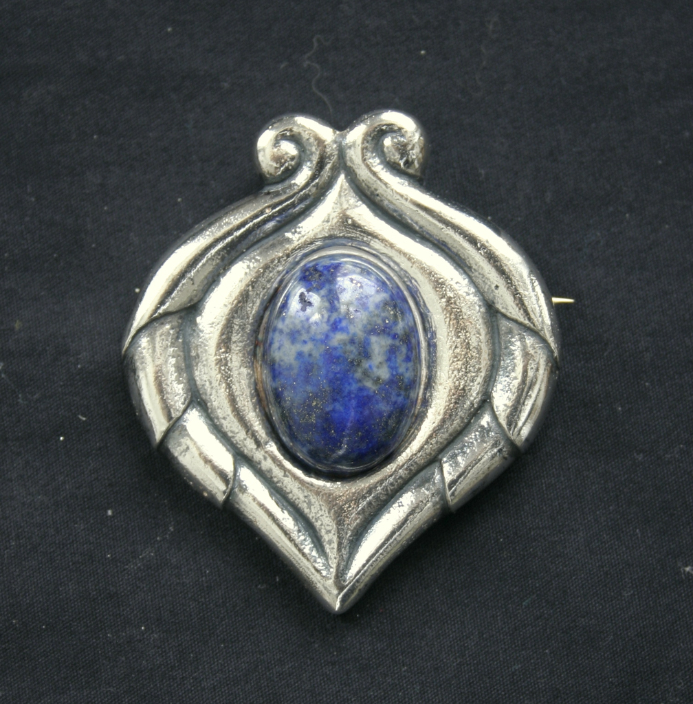 Een zilveren broche/hanger gezet met een lapis lazuli (50 x 60 mm). Ook mogelijk uitgevoerd met amethist, tijgeroog, nefriet, opaline, carneool of chalcedoon.