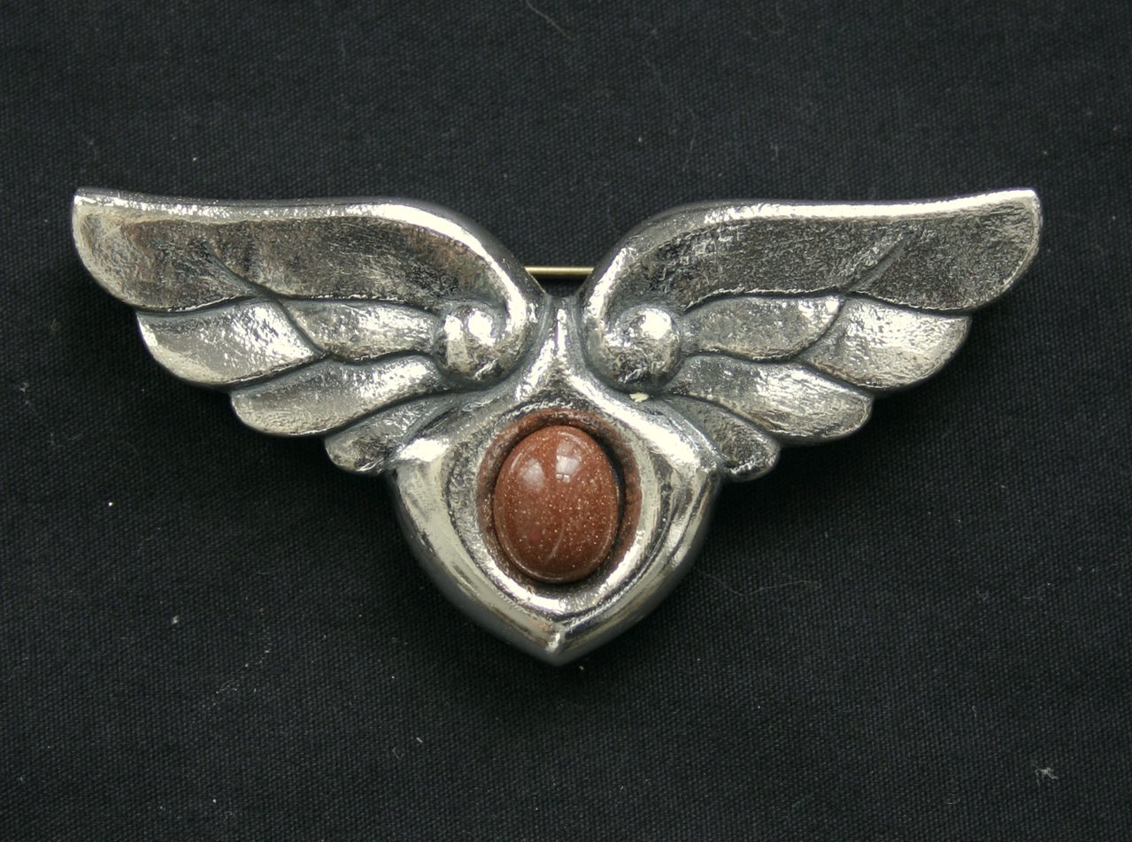 Een gevleugelde zilveren broche/hanger met een goudsteen (73 x 36 mm). Ook als uitvoering met turkoois mogelijk.