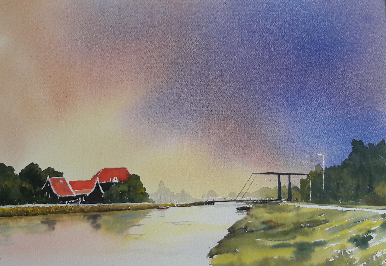 Realistische aquarellen en olieverf schilderijen van Hollands landschap, met altijd expressieve luchten boven de lage horizon zich spiegelend in de waterrijke polder. Ook werken uit de Franse Morvan en van de Oostelijke Algarve in Portugal.