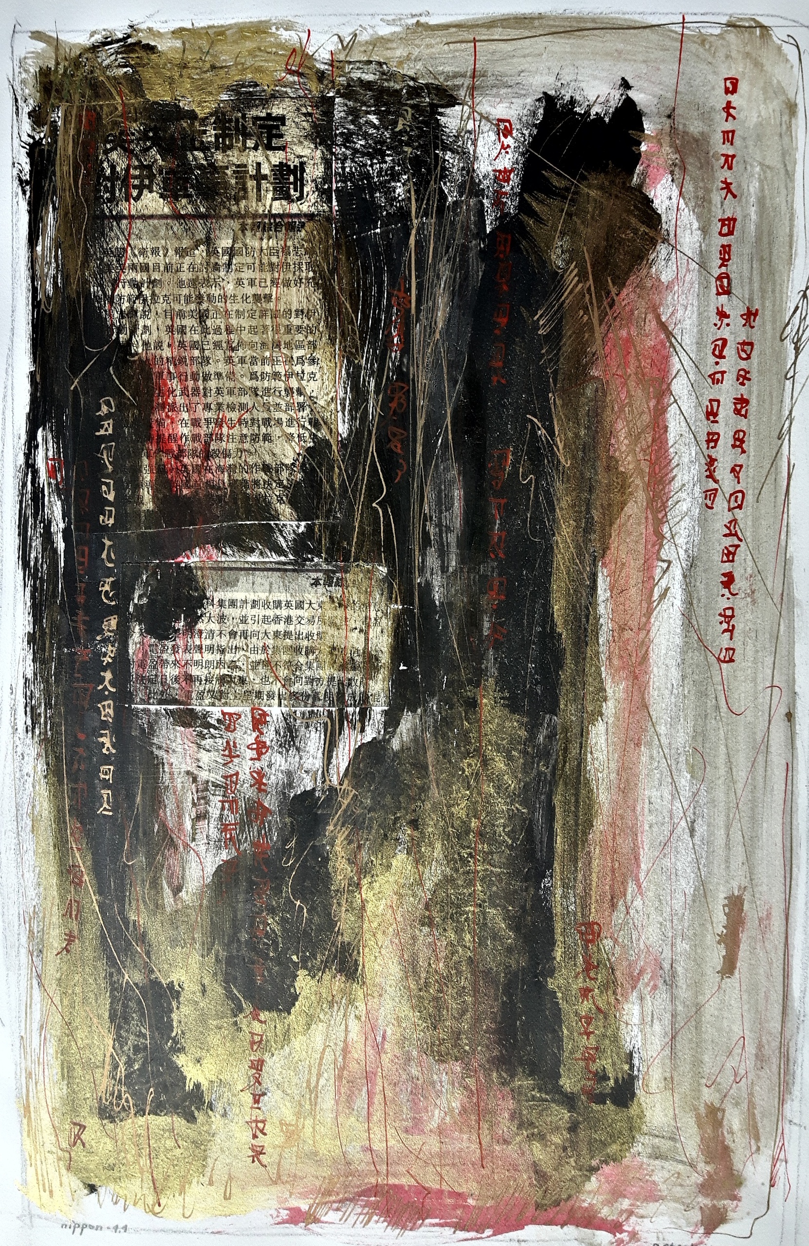 Nippon 1, c.q. Tsuru No Hitokoe (= De stem van de kraanvogel) no.3 is een werk uit mijn Heart of Zen / Japan-reeks, en dateert uit 2008. Lange tijd zat het opgeborgen in een map. Immers, ik werk aan mijn Heart of Zen reeks met grote tussenpozen. Vergeten op mijn website te plaatsen. Het werk is een gemengde techniek bestaande uit Japanse krantenknipsels, vermengd met acrylverf, Oost Indische inkt, en goudverf op 200 grams geschept papier.
