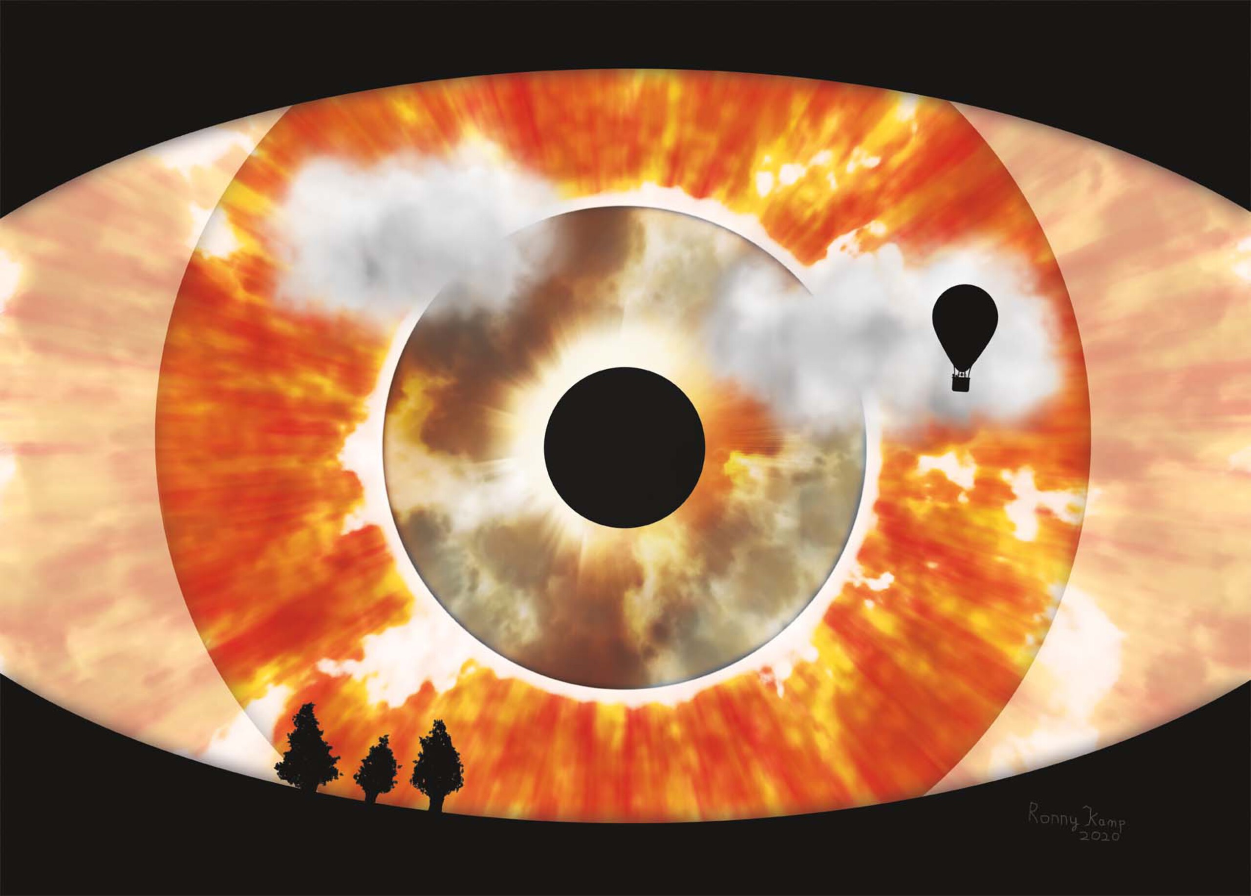 Vlammend oog of ontploffende zon. Op de voorgrond silhouetten van bomen en een heteluchtballon. Een griezelige aanblik van een gebeurtenis die met zekerheid een grote verandering teweeg brengt.
