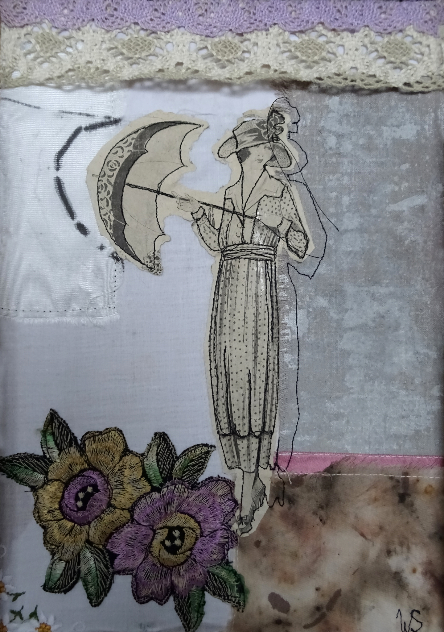 Mixed media o.a. antiek zakdoekje, papier corsage, machinaal borduurwerk en stof
