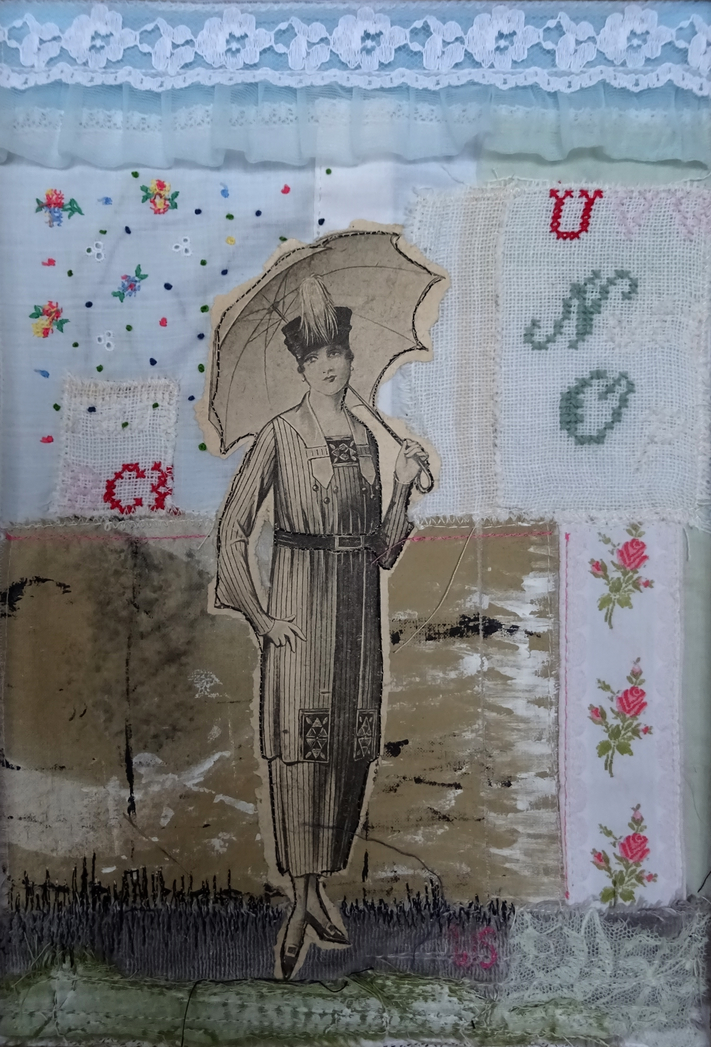 Mixed media o.a. antiek zakdoekje, papier, band, machinaal borduurwerk en stof