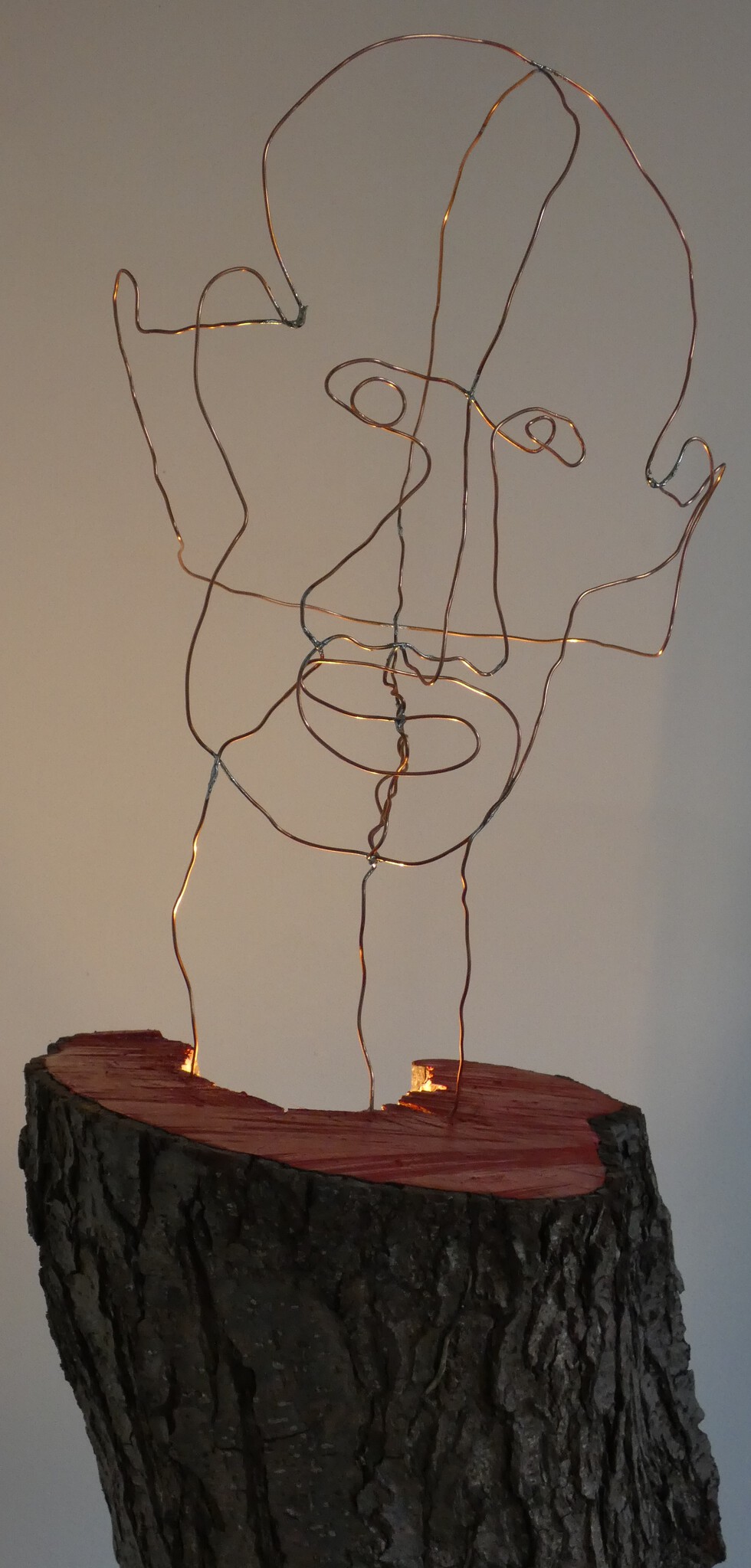 Kop van koperdraad op sokkel van een stuk van de stam van een wilg. Er zit een lampje in de wilgenstam dat er voor zorgt dat de kop wordt belicht.