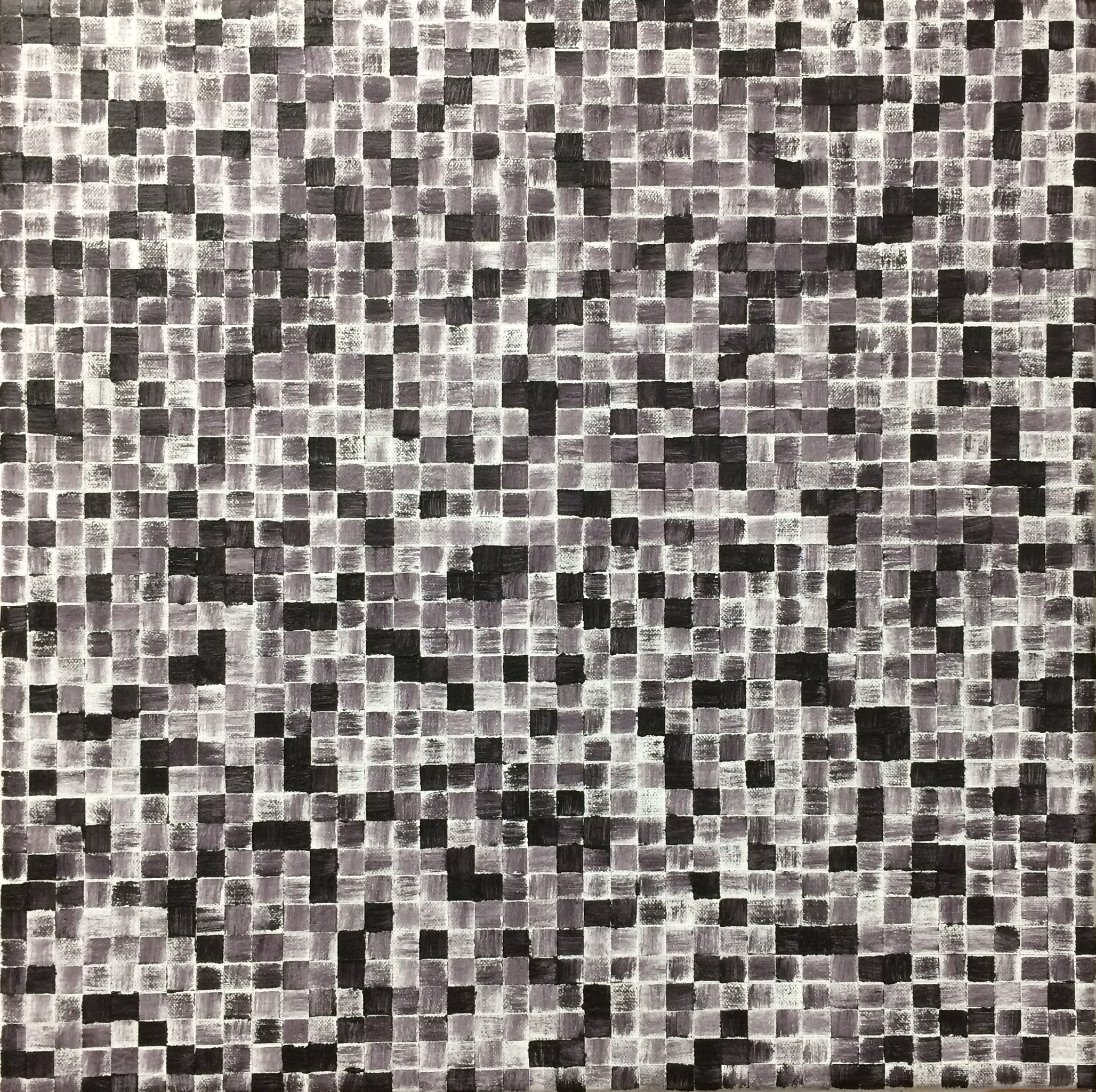 Thema: Chaos (Geometrische Chaos) Mijn kunst is beïnvloedt door de moderne wiskundige en wetenschappelijke benadering van het begrip complexe orde van de natuur. Met name heb ik me verdiept in de Chaos theorie en de fractal geometrie. Ik ben geen wiskundige, en ik gebruik geen wiskundige formules. De ideeën van de Chaos theorie en fractal geometrie leiden tot de ontwikkeling van de composities in mijn werk. Ik gebruik driehoeken,vierkanten en cirkels in mijn schilderijen, maar in mijn huidige serie, geoChao richt ik me alleen op de vierkanten en de verhoudingen tussen de vierkanten. Ik ontwikkel mijn composities door kleine vierkantjes op grote te zetten of grote op kleine te zetten. Het gaat om de onderlinge verhoudingen tussen de vierkanten. Ik laat de methode die ik kies de compositi