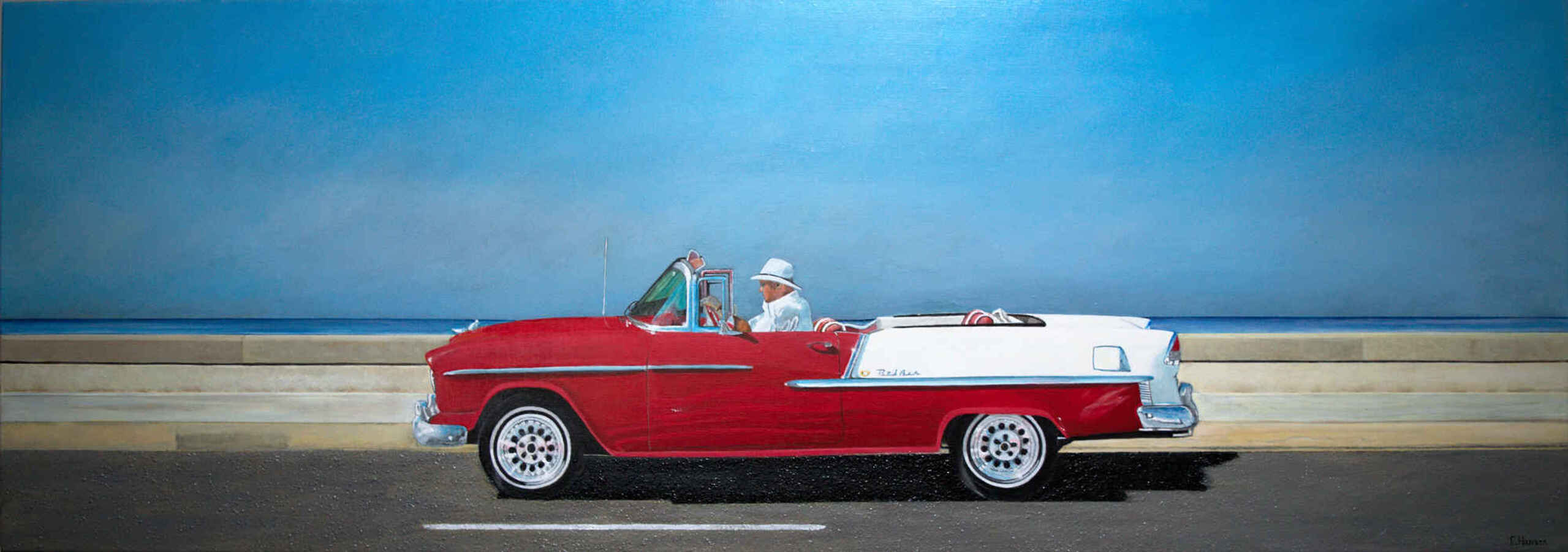 Schilderij: Acryl op canvas. Het schilderij is tot stand gekomen na een vakantie in Cuba. Toen ik al die kleurrijke klassieke auto's zag rijden in de hoofdstad Havana. raakte meteen geïnspireerd, Ik hoop dat je net zo geïnspireerd raakt door deze oude Chevrolet Bellair convertible 1957 op de boulevard in Havana. geschilderd op portretlinnen