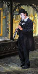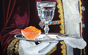 Schilderij: Acryl op canvas. De oude Hollandse meesters zijn de inspiratiebron voor het schilderij Na een bezoek aan het Rijksmuseum in Amsterdam raakte ik geïnspireerd door de 17e eeuwse kleding de prachtige kanten kragen en de fluwelen jassen met de speciale sluitingen, fantastisch weergegeven op het canvas van Rembrand, Vermeer etc. Toen ik thuiskwam, besloot ik om ook iets in dezelfde trend te schilderen. Nou, dit is het geworden, ik noem het, "De butler" Ik hoop dat je het leuk vind ? Geschilderd op portretlinnen. Inclusief zwarte baklijst.