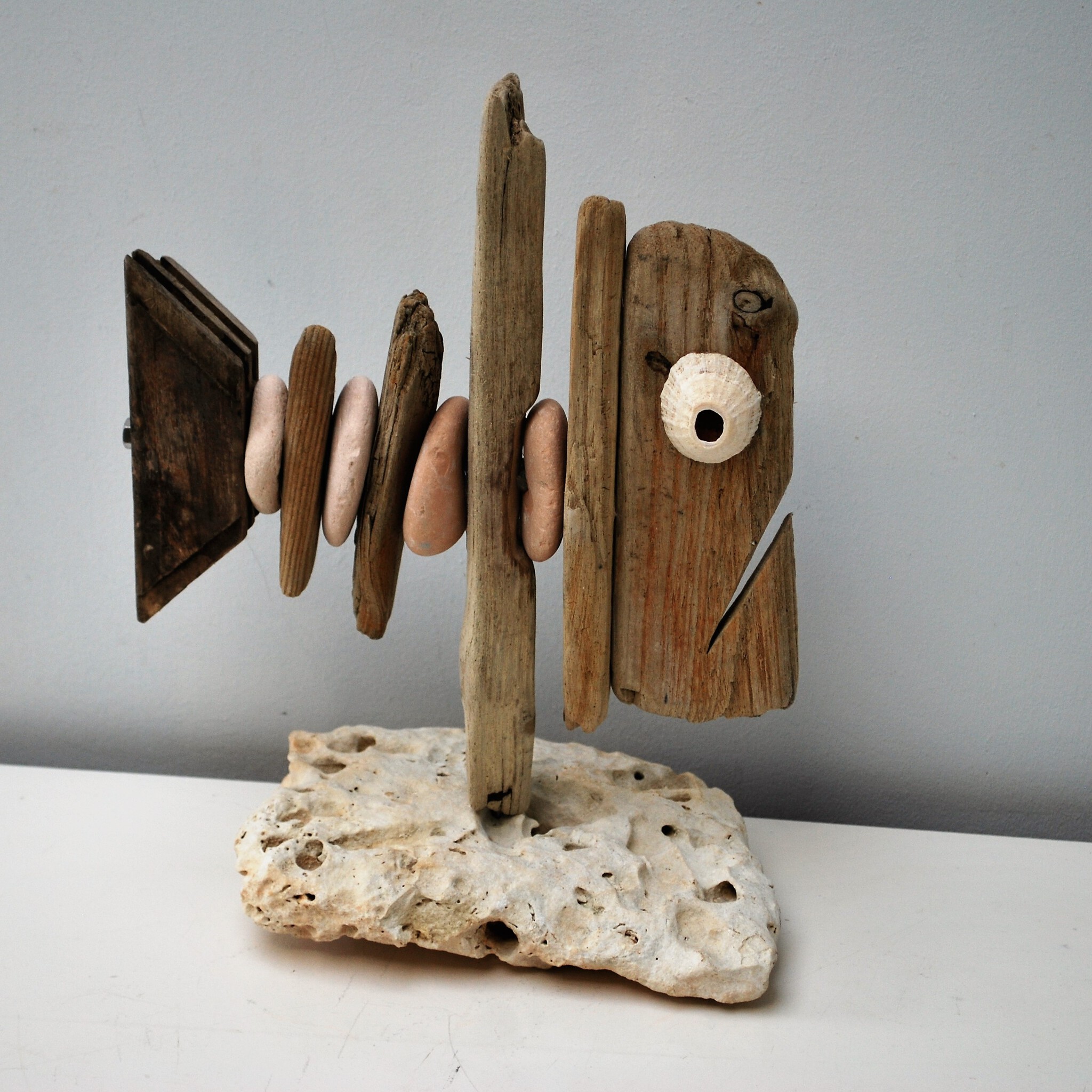 maakt al jaren houten beelden door natuurlijke objecten uit zee te koppelen. De beelden zijn ruw en puur.