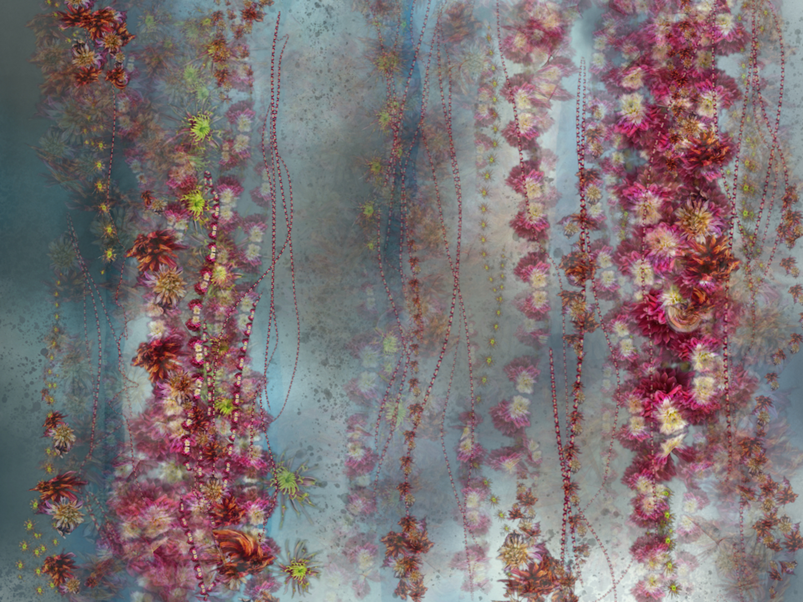 painted with Diana’s own made digital photo-pencels of home grown leaves en dalia’s. available in various sizes, printed on dibont and framed