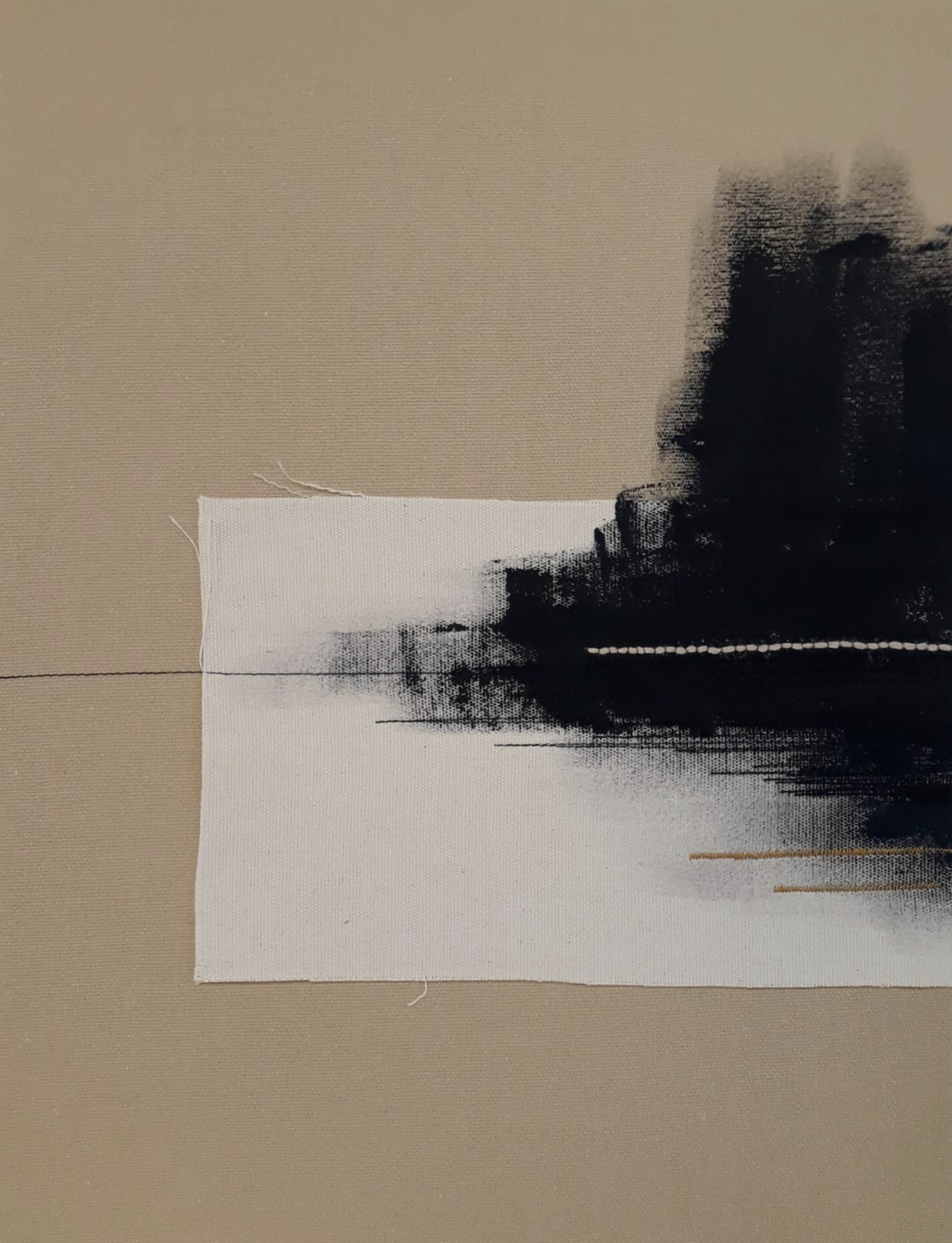 Acrylverf op onbewerkt canvas voorzien van draad en stiksels