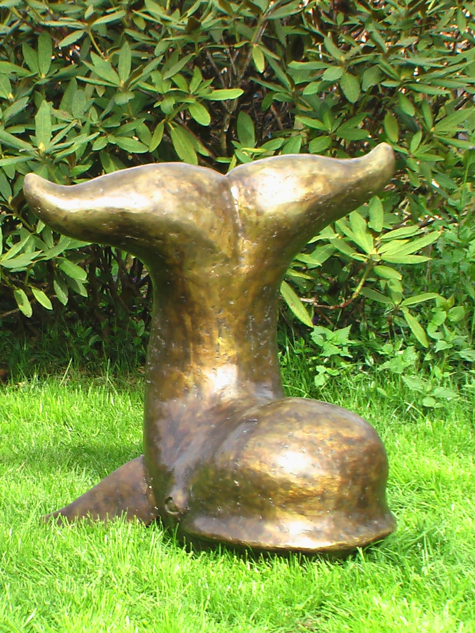 Walvis/Whale Materiaal/Material: Brons, Bronze Gewicht/Weight: 26 kg Gemaakt in/made in: Apeldoorn, 2001 Oplage/Edition: max. 3 exemplaren, nog 2 ex. te koop. Opmerkingen/Notice: Deze walvissen zijn speelse beelden door de bolle vormgeving en met toch een sierlijke beweging in de omhoog gaande staart. Het water kan er omheen en vanaf vloeien, maar tegelijkertijd staat het als bronzen beeld.
