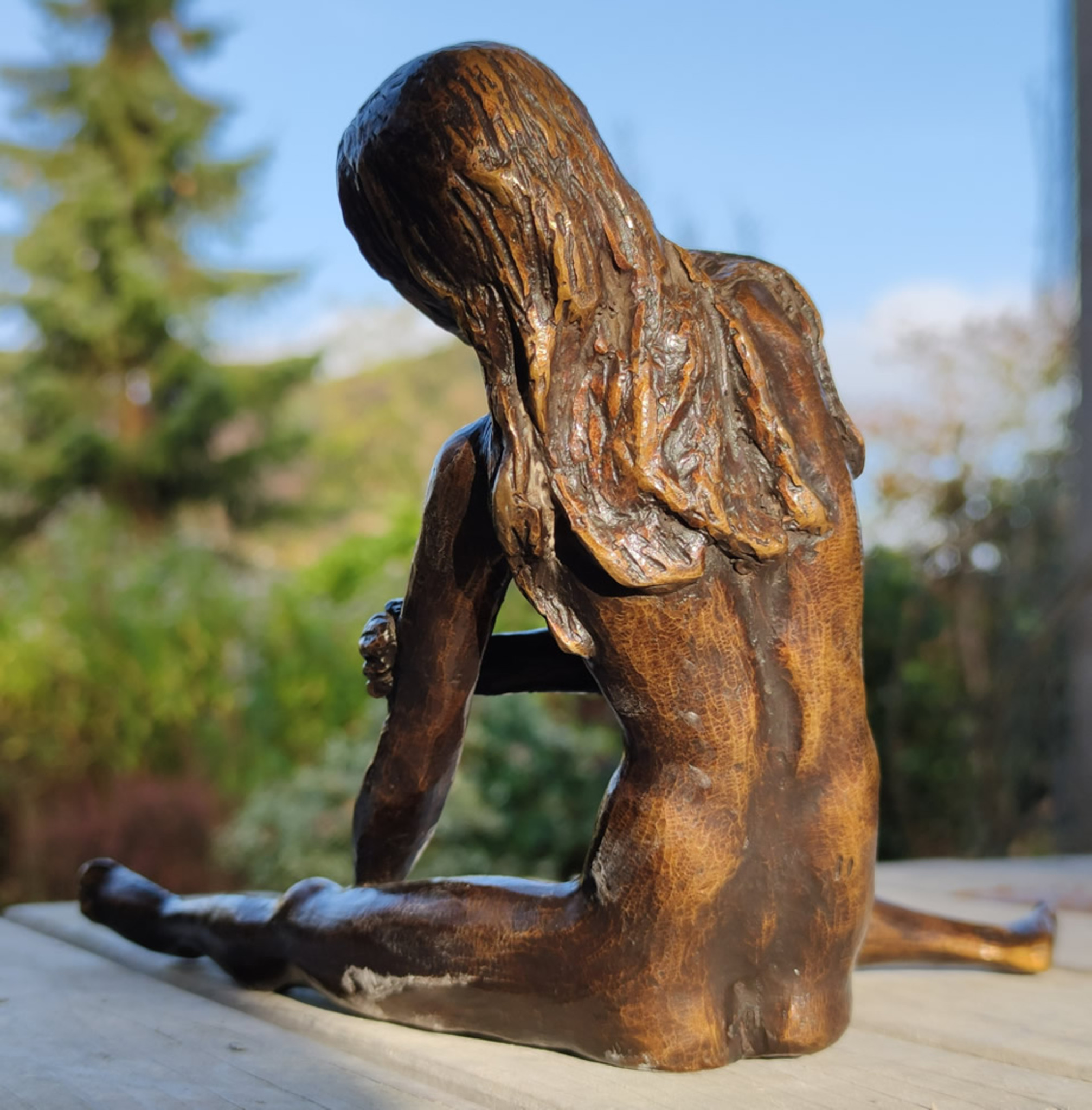 Zittende naakte vrouw/Sitting nude female Materiaal/Material: Brons, Bronze Gewicht/weight: 3 kg Gemaakt in/made in: Apeldoorn, 2002 Oplage/edition: max. 5 exemplaren, nog 3 ex. te koop. Opmerking: Het menselijk lichaam was interessant om vorm te geven om vormen en beweging te creëren. De patinering kan de ene keer iets donkerder zijn, de andere keer wat lichter.