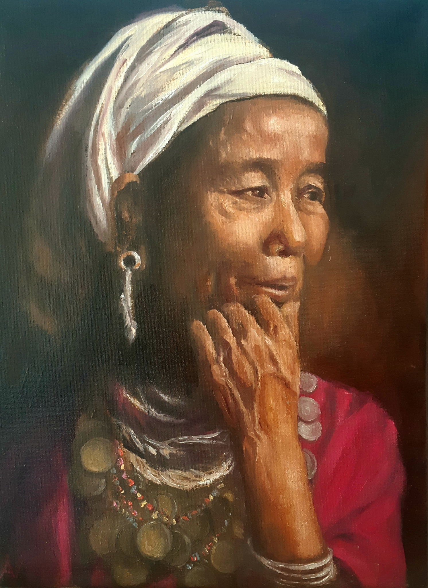 Een mooie oudere vrouw. Ze lijkt tevreden en gelukkig. Haar levensjaren zijn haar aan te zien,, dat geeft karakter en een mooie uitstraling. Ik heb hiervoor het Zorn palet gebruikt met als extra toevoeging Alizarin Crimson voor haar shirt.