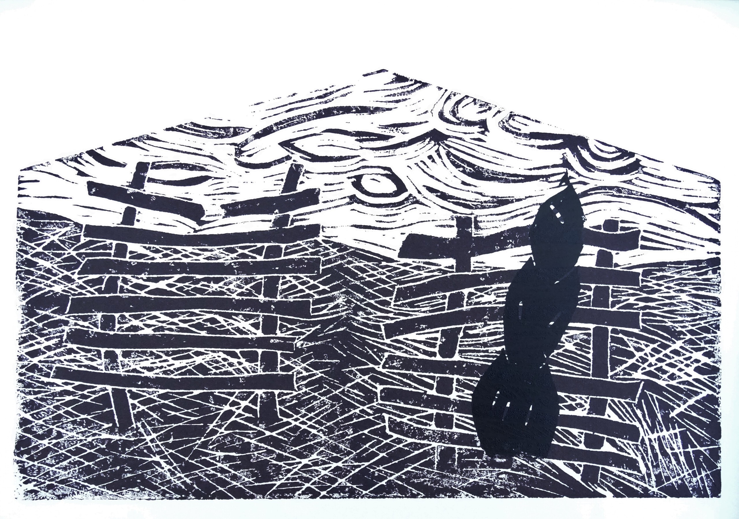 "De hekken werden eerst gemaakt / om een zekere afstand te creëren / tot het landschap. // Toen moest de plaats van de wachter worden bepaald / en die kwam voor het hek. // Hetwelk gezien de omstandigheden / op z'n plek is." lino-snede