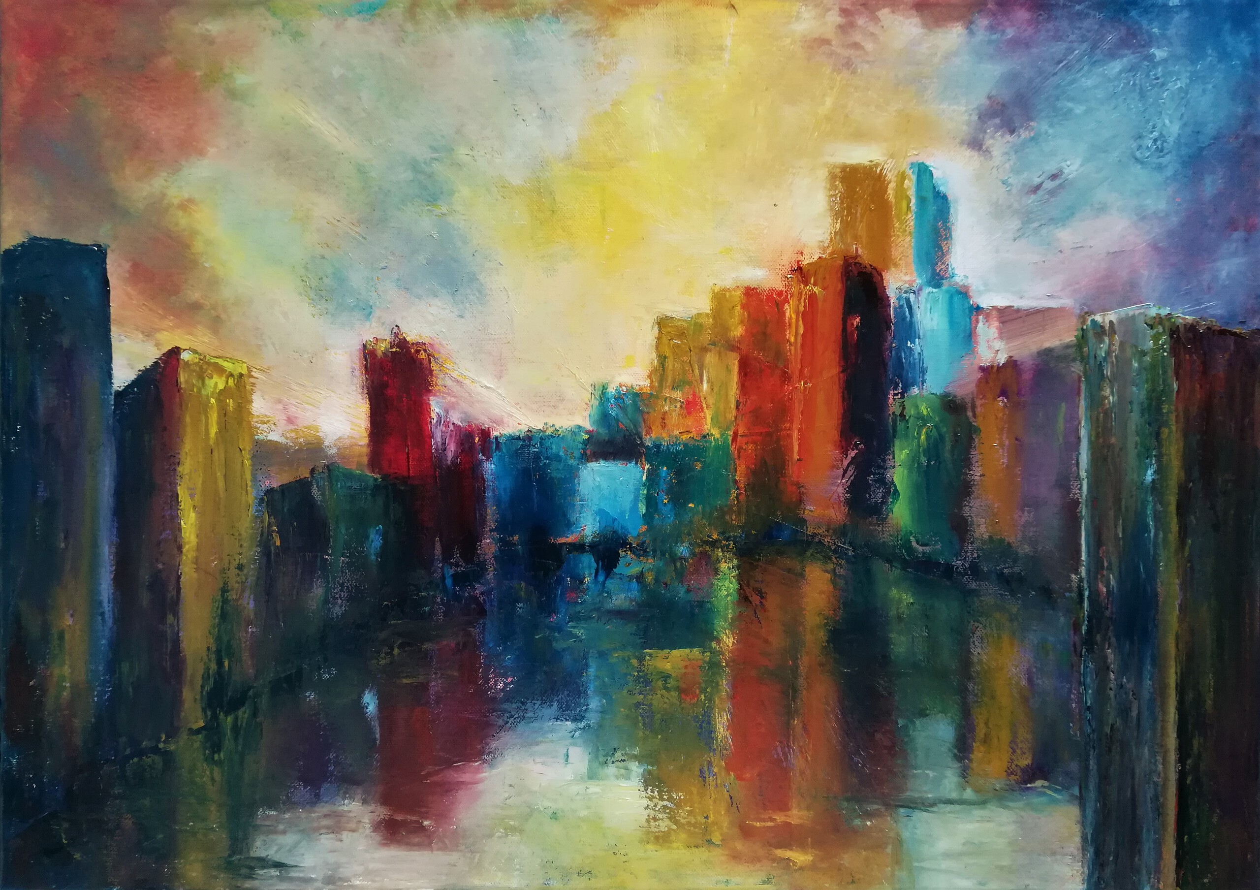 Abstract van een zeer kleurrijke stad aan het water. Geschilderd met het paletmes. De lucht is vol met gekleurde wolken. Dit schilderij is geschilderd op een doek dat ik in een workshop had gebruikt. Het zat dus vol met kleuren en olieverfoefeningen met het paletmes. Ik heb deze strepen en vlekken in dit schilderij gebruikt.