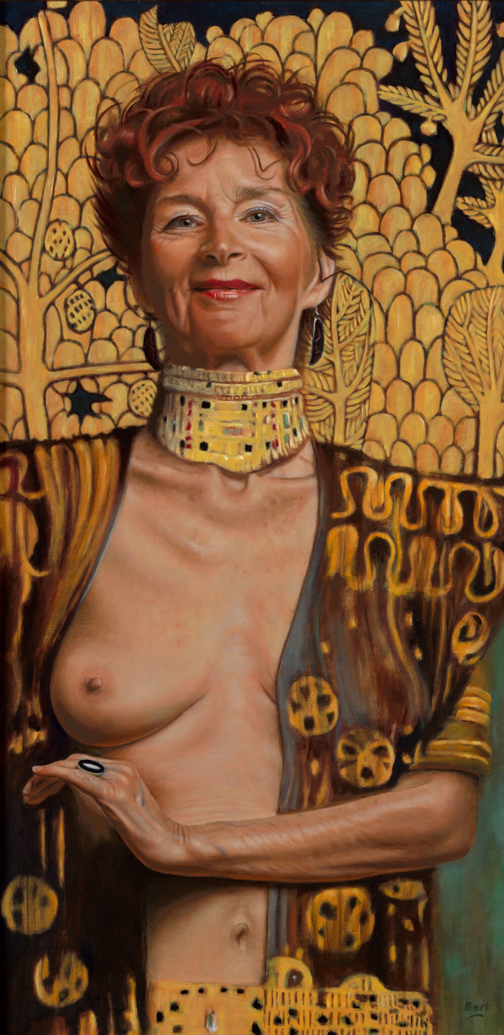 Carla’s halsband. Olieverf op paneel, 84 x 42. 2020. ‘Carla’s halsband’ is geïnspireerd op het schilderij ‘Judith und Holofernes’ van Gustaf Klimt (1901). Mijn lief Carla draagt nu al 24 jaar een halsband. Zij is chronisch ziek en ernstig gehandicapt. Desondanks is zij er met veel discipline in geslaagd om haar leven gedeeltelijk weer op te pakken. Het schilderij is een ode aan haar wilskracht en levenslust. Met haar hand is zij haar verzwakte lichaam – tot nu toe – de baas, zoals Judith Holofernes overmeesterd heeft. Zie voor een uitgebreide toelichting en een weergave van het schilderij inclusief de lijst de pagina Carla's halsband (zie linkerkolom).