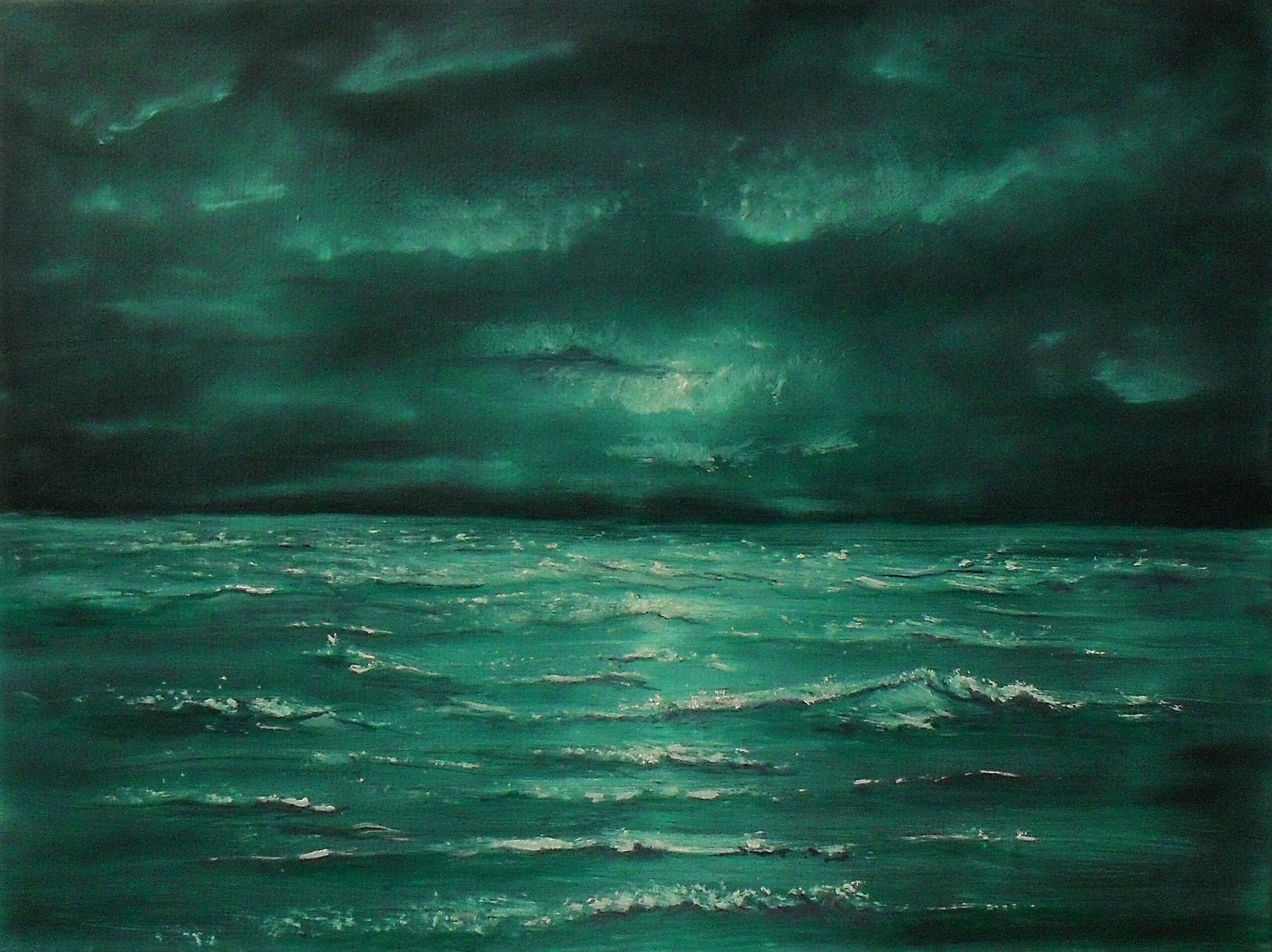 Ik schilderde dit kleine werkje op een zwart canvas. De turquoise kleur gaf de oceaan een spookachtige glans in deze nacht. Met het licht van de bleke witte maan kun je je voorstellen hoe het zou zijn om daar te staan.