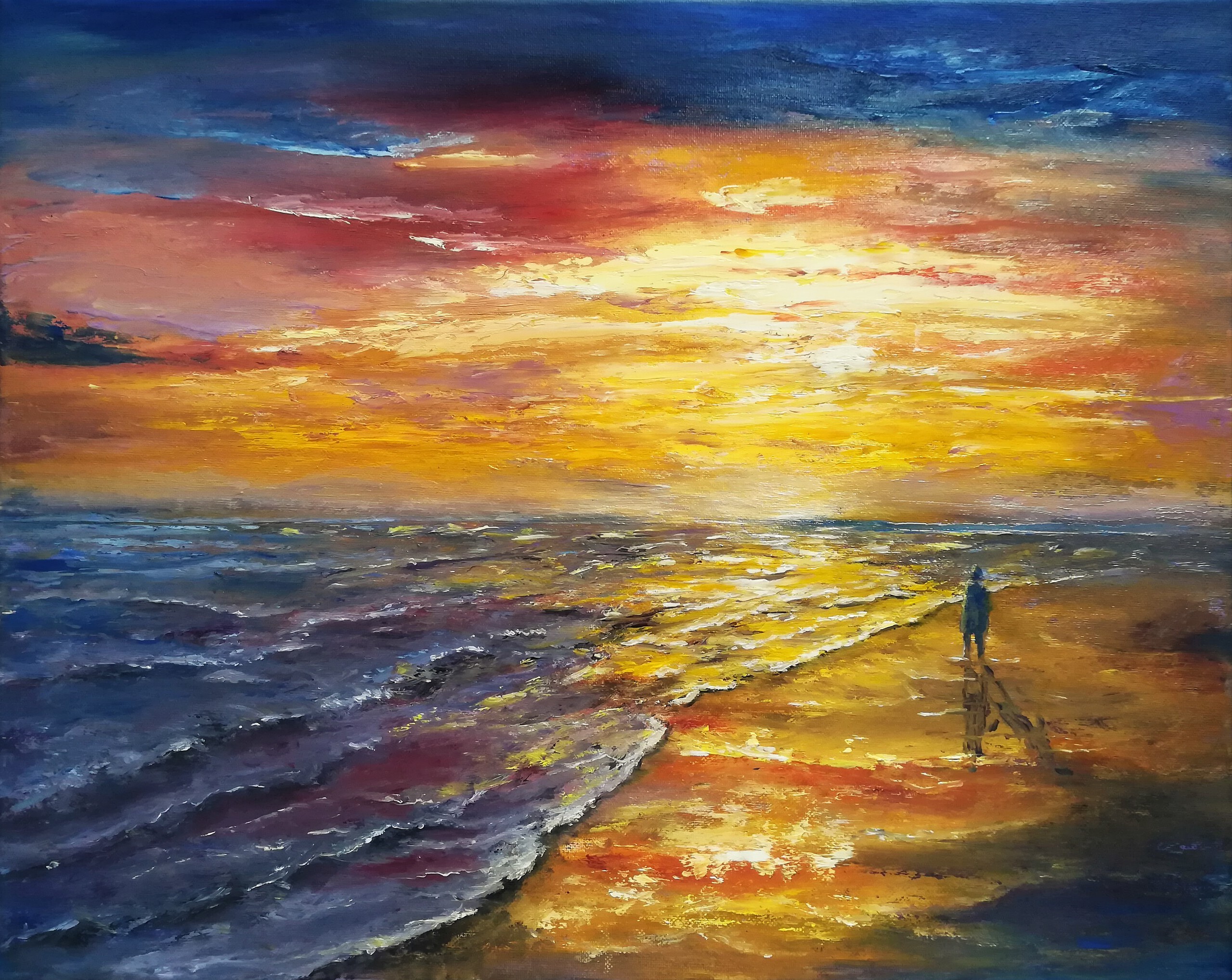 Er staat iemand op een kleurrijk strand. Hij of zij is volledig op zijn gemak en voelt niets anders dan vrede. Hij heeft alle tijd ter wereld. "Dit zeegezicht is een symfonie van warme kleuren die smelten in koude tinten van de avond, zo poëtisch geschilderd dat de kijker zich begint af te vragen of zijn muziek in kleuren stroomt en vervolgens in poëzie en terug. Zo betoverend!" door Alan LeFrancophile op facebook.