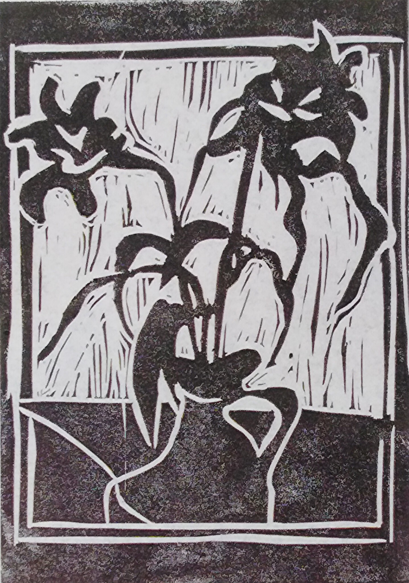 Good old fashioned linosnede. Interpretatie van eigen oude tekening naar waarneming. (zwart/wit)