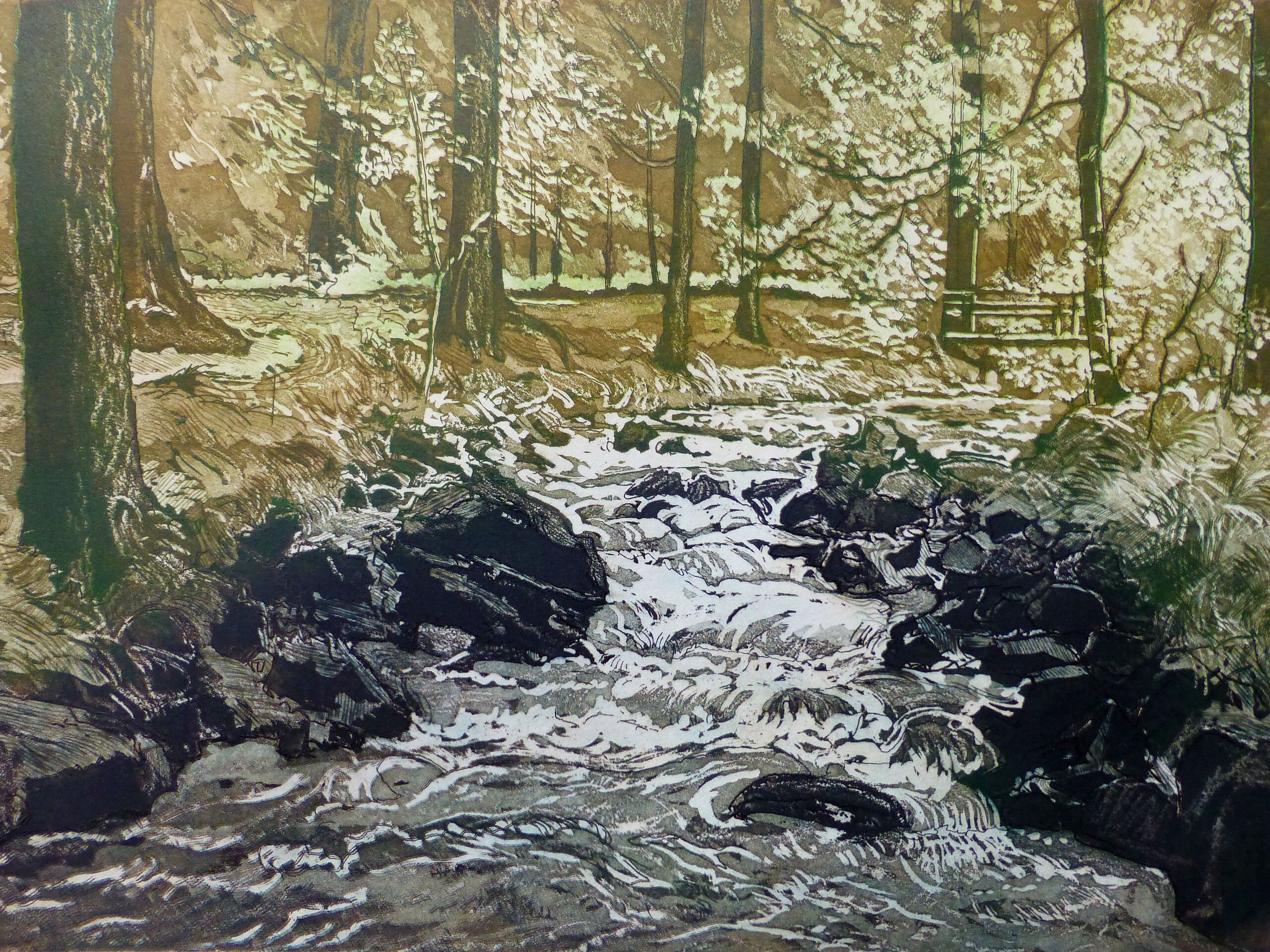 Snel stromende beek in een bos met een mooie lichtval en een bruggetje op de achtergrond