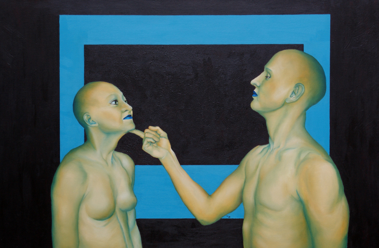 Schilderij Geel Blauw Yellow Vrouw Man Naakt Blue Licht Van Woman Nude Oil Canvas Figuur Painting On Kleur Mensfiguur Kaal Human Netherlands Bianca Colour Bald