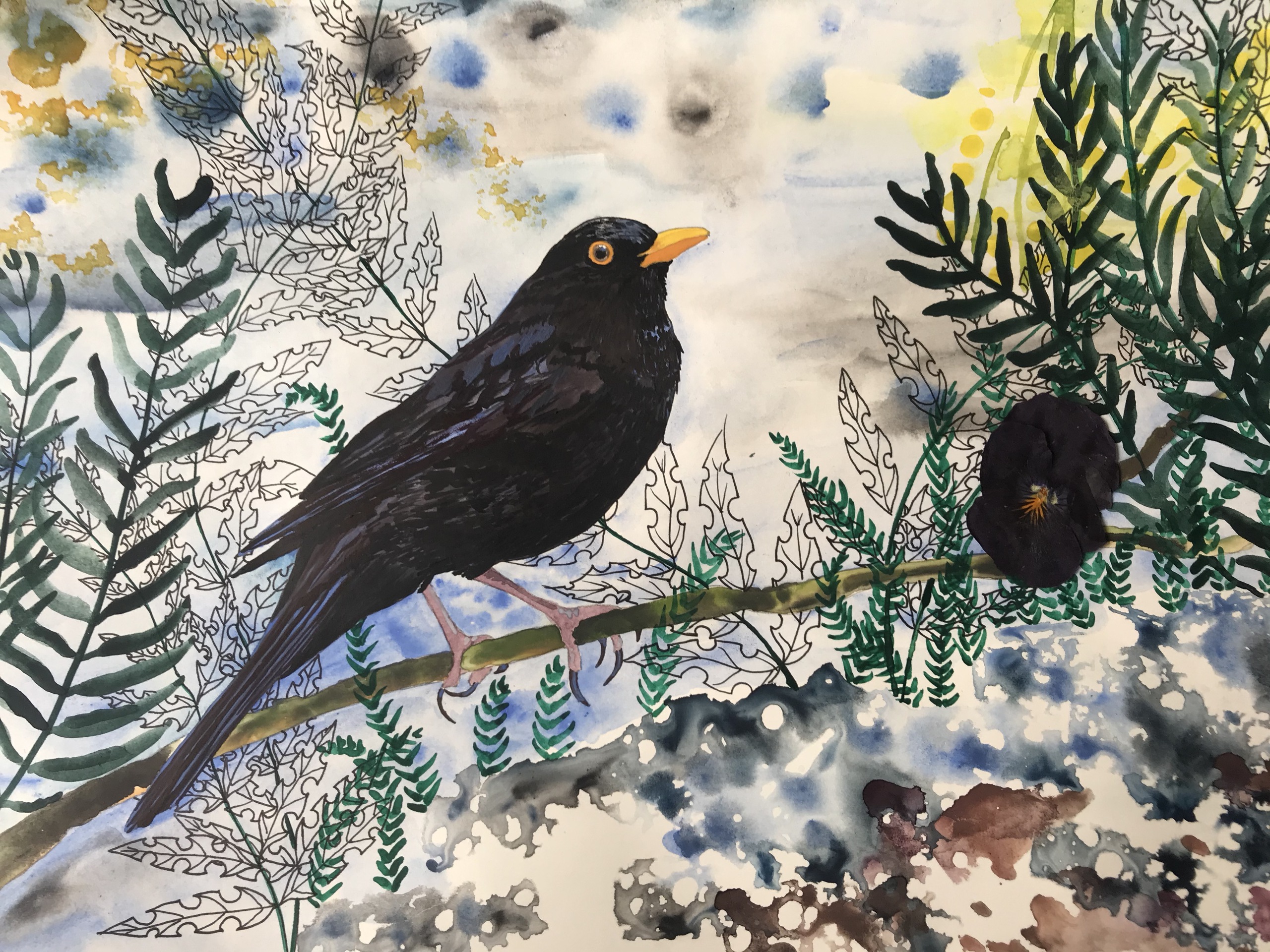 Aquarelverf, pen en droogbloem op papier.